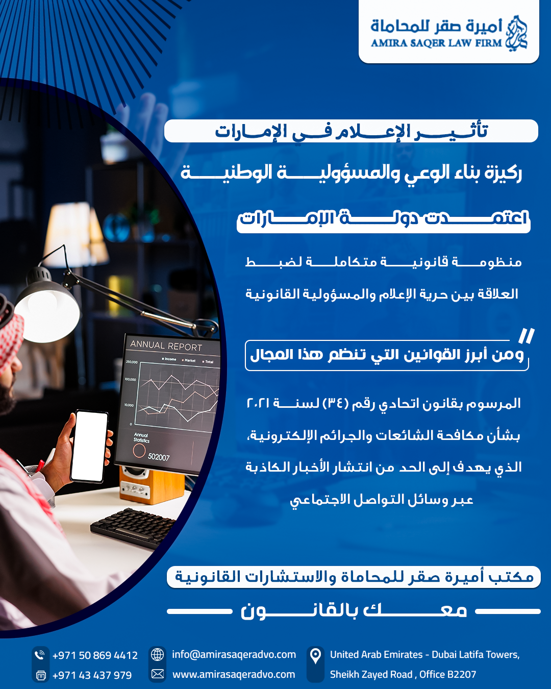 - المرسوم بقانون اتحادي رقم (34) لسنة 2021 بشأن مكافحة الشائعات والجرائم الإلكترونية: يهدف إلى الحد من انتشار الأخبار الكاذبة عبر وسائل الإعلام ووسائل التواصل الاجتماعي.